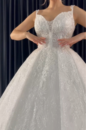 Impresionante vestido de novia con tul decorado con brillo, cristales, canutillos.